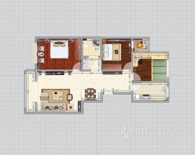次臥室:作為兒童房來用的次臥室,因為小孩年紀比較大,獨立性比較強,在追求獨立的時候有自己特立獨行的方式,在做簡單的家具布置和裝飾后,擱置搭配以極度夸張的裝飾畫,內(nèi)容自定,緊連著陽臺書房